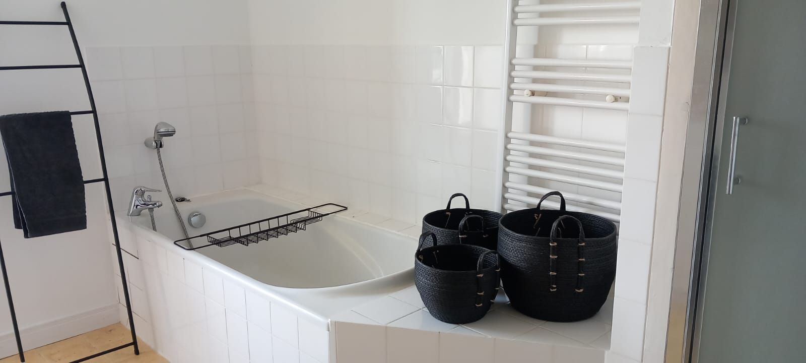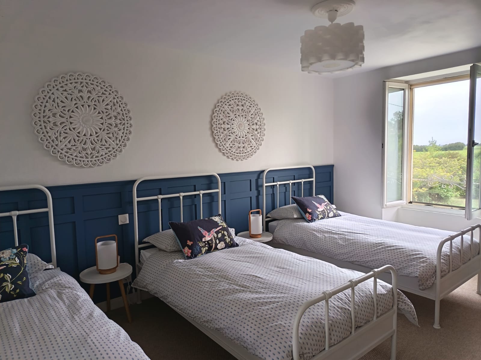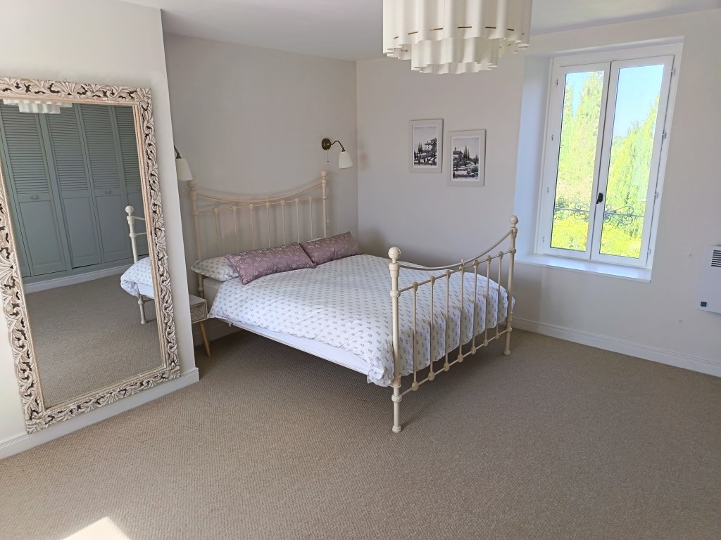 Upstairs in the main house there are three bedrooms and a family bathroom. The master bedroom has a super king size bed, the second bedroom has a double bed and the final bedroom has three full size single beds. All bedrooms have duel aspect windows which provide beautiful views and a welcome breeze in the summer months. The generous size family bathroom has a bath, a shower, a WC and two sinks. The window offers views across the garden and the surrounding countryside and vineyards.